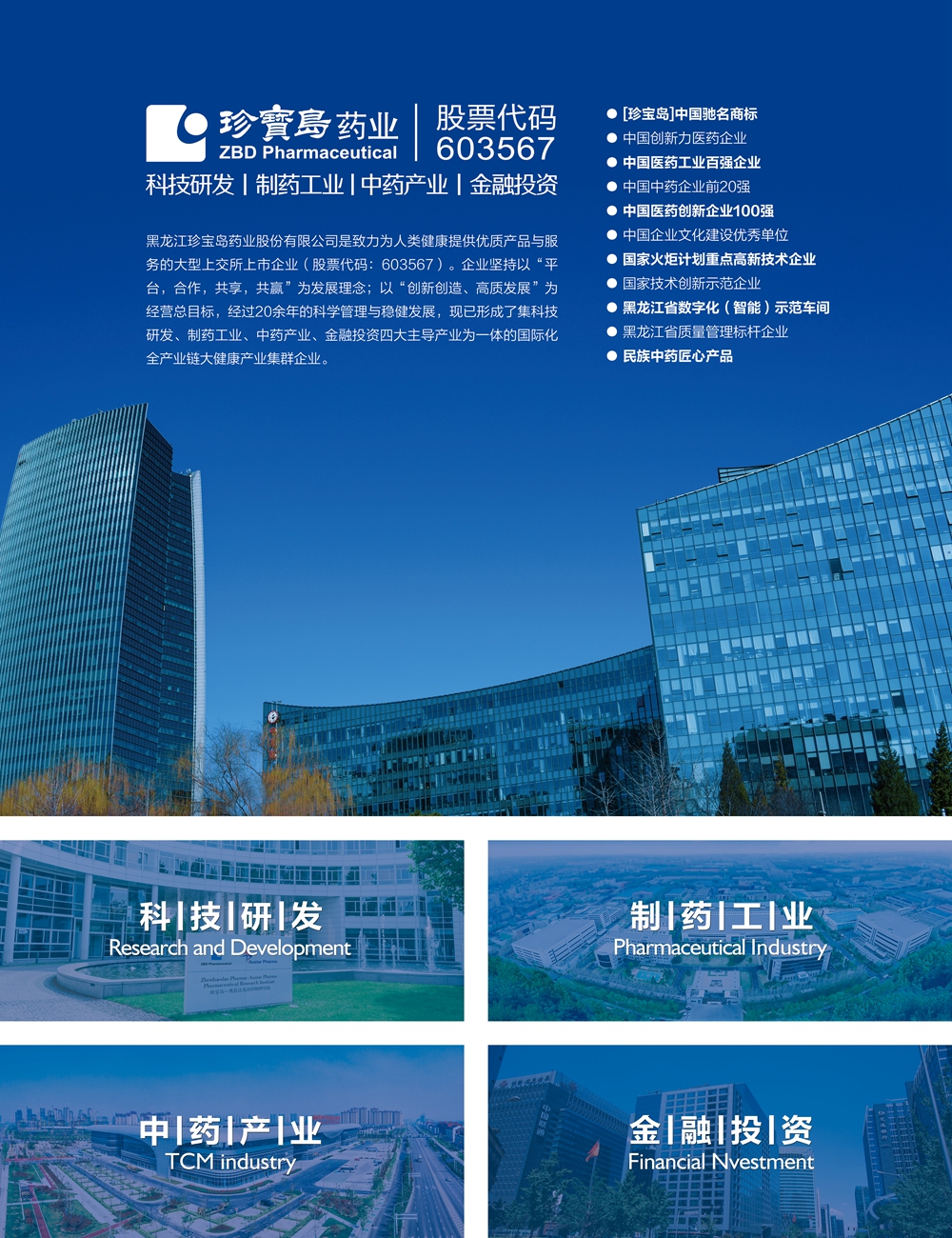黑龍江珍寶島藥業(yè)股份有限公司(603567.SH)創(chuàng)立于1996年。作為國(guó)際化醫(yī)藥健康產(chǎn)業(yè)集團(tuán),公司以“為世界提供優(yōu)質(zhì)健康產(chǎn)品與服務(wù)”為企業(yè)使命,以“平臺(tái) 合作 共享 共贏”為發(fā)展理念,堅(jiān)持“一心三園四平臺(tái)”發(fā)展戰(zhàn)略,以“六位一體”運(yùn)營(yíng)模式推動(dòng)企業(yè)經(jīng)營(yíng)轉(zhuǎn)型。打造醫(yī)藥行業(yè)新質(zhì)生產(chǎn)力前沿陣地,加快科技研發(fā)成果轉(zhuǎn)化與應(yīng)用,積極參與國(guó)家醫(yī)藥產(chǎn)業(yè)項(xiàng)目建設(shè),構(gòu)建國(guó)際化綠色智慧制藥新平臺(tái)。珍寶島藥業(yè)長(zhǎng)期穩(wěn)居中國(guó)醫(yī)藥工業(yè)百?gòu)?qiáng)、中國(guó)中藥企業(yè)前二十強(qiáng)行列。業(yè)務(wù)領(lǐng)域涉及科技研發(fā)、制藥工業(yè)、中藥產(chǎn)業(yè)、金融投資四大板塊,是中國(guó)醫(yī)藥行業(yè)最具創(chuàng)新力的醫(yī)藥企業(yè)之一。