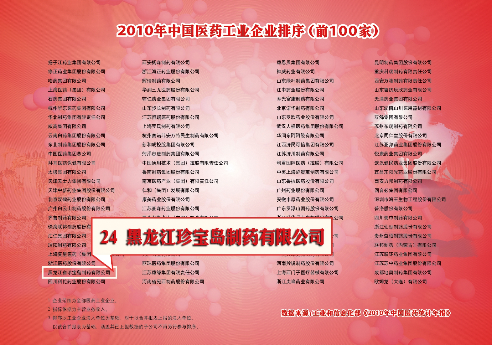 黑龍江珍寶島藥業(yè)股份有限公司成立。企業(yè)躋身中國(guó)醫(yī)藥工業(yè)第15強(qiáng)。