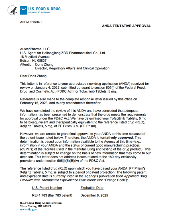 5月26日,珍寶島藥業(yè)發(fā)布公告,公司收到美國食品藥品監(jiān)督管理局(簡(jiǎn)稱“美國FDA”)的通知,珍寶島藥業(yè)向美國FDA申報(bào)的枸櫞酸托法替布片的新藥簡(jiǎn)略申請(qǐng)(ANDA,即美國仿制藥申請(qǐng))已獲得暫時(shí)批準(zhǔn)(暫時(shí)批準(zhǔn):指FDA已經(jīng)完成仿制藥的所有審評(píng)要求,但由于專利權(quán)或?qū)Yu權(quán)未到期而給予的一種批準(zhǔn)形式)。
